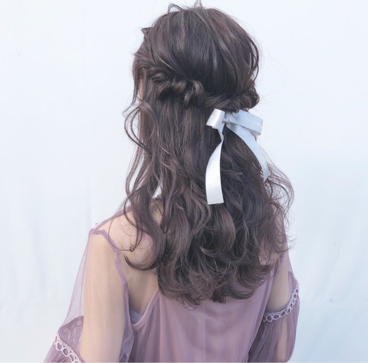 サイドの髪でつくる品の良いハーフアップです。可愛らしく、ふわふわとバランスよく毛を引き出しましょう。