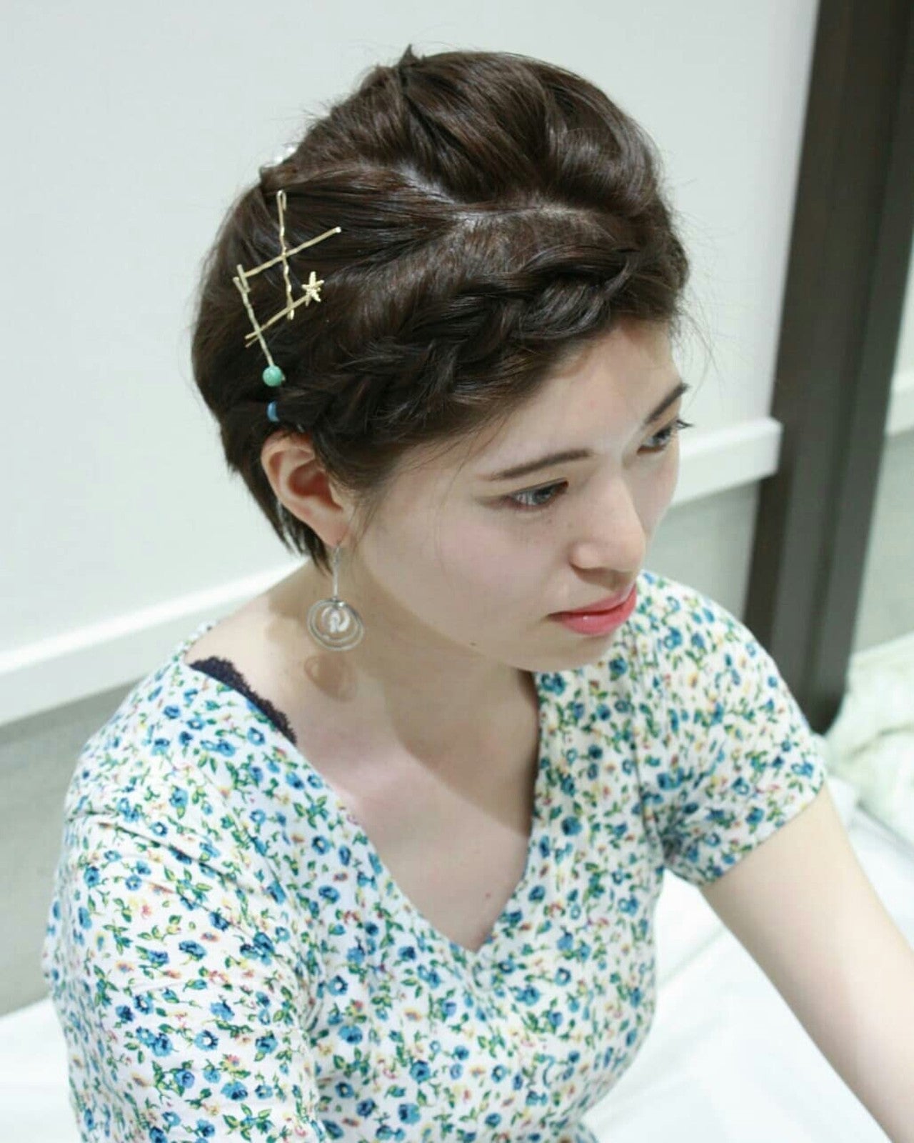 前髪を編み込みにしたショートヘアアレンジです。つけるピンの種類で雰囲気が変わって◎。