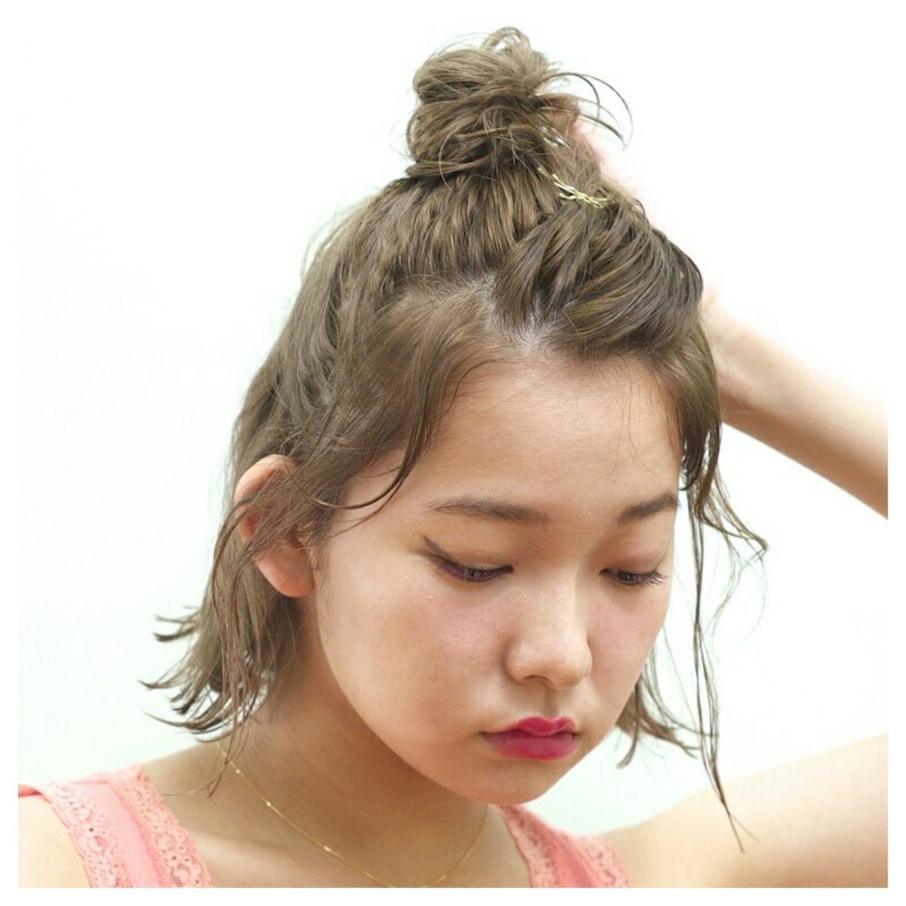 前髪もいっしょに上げてお団子にアレンジ。前髪をふた束引き出して巻けばルーズでこなれた印象に♪