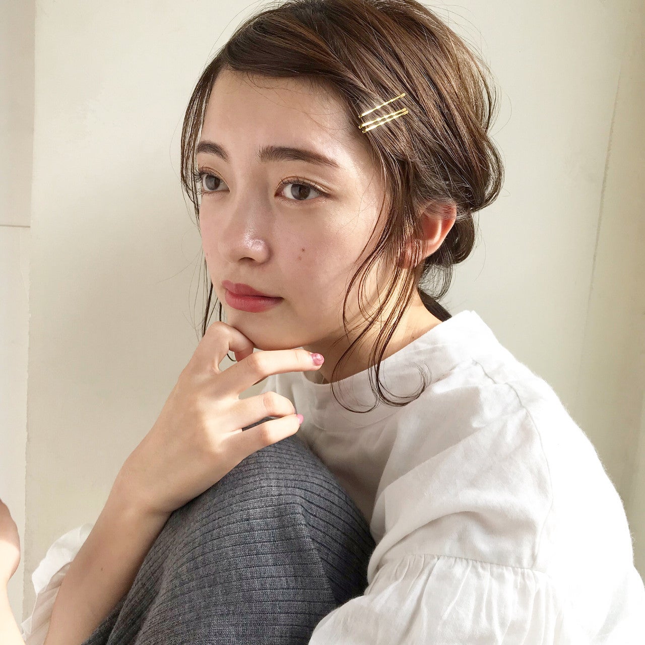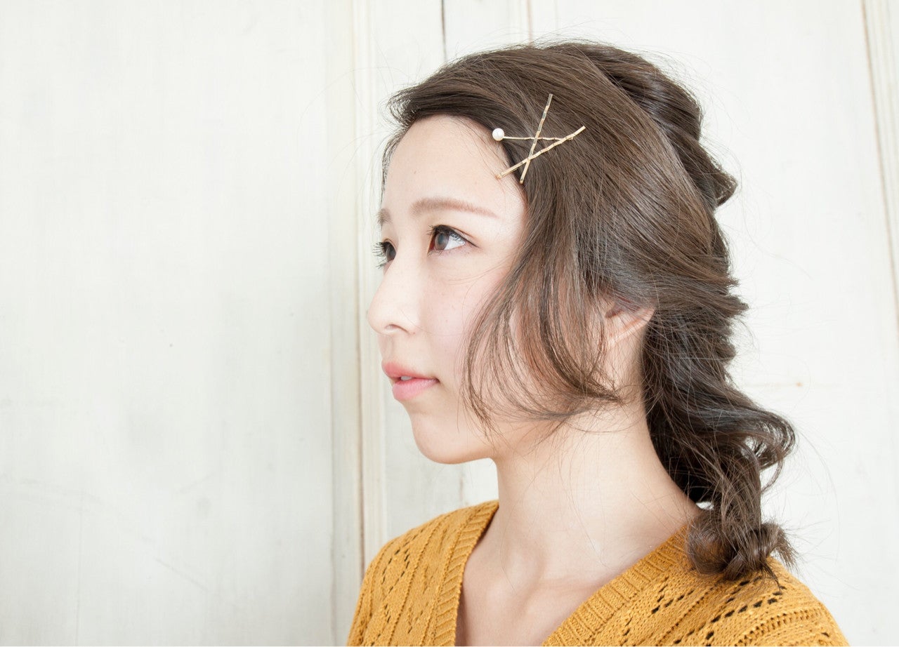 サイドに流してゴールドピンで留めるだけでもOK!ピンはクロスしたり大量付けするのが今っぽ。