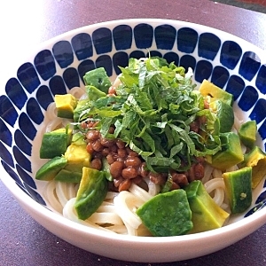 アボカド納豆はめんつゆでいただくのも美味♡いつものうどんに飽きたらぜひ!薬味のしそもたっぷり入れてどうぞ♡