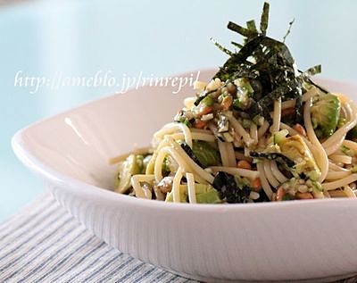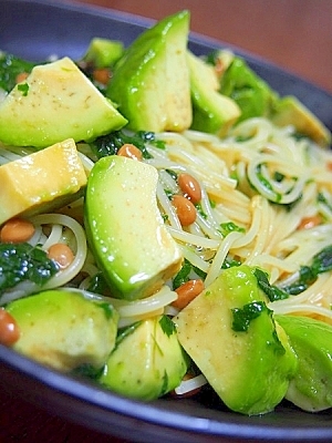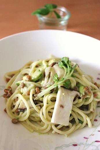 ねばねば好きにはたまらない納豆にモロヘイヤもプラスした和風パスタの完成♪濃厚なアボカドがパスタと絡みます♡