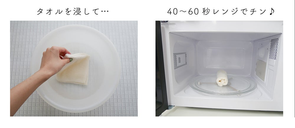 目を冷やした後は、蒸しタオルで温めてあげてください。ちょっと面倒くさそうな蒸しタオル、実は手軽に作れますよ。水分を含ませたタオルを用意して、レンジで40〜60秒ほど温めてあげるだけ!この蒸しタオルも目の上に乗せて5〜6分待ってくださいね。