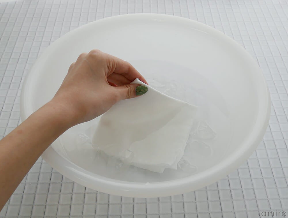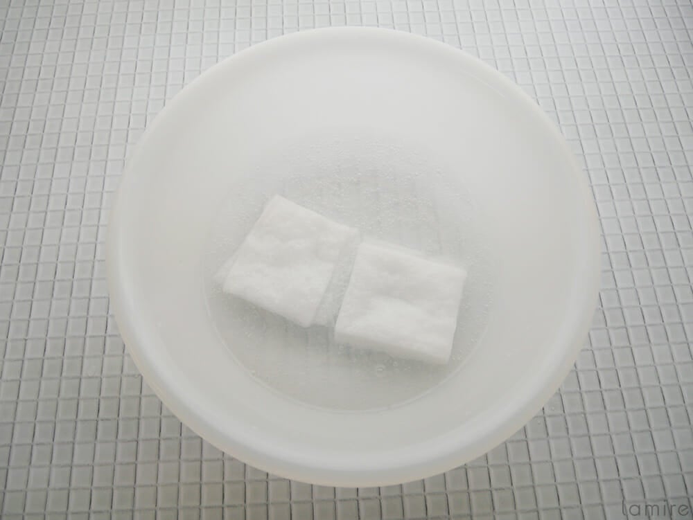 氷水が入った器にガーゼを入れて少し冷やしてください。用意ができたら、目の上にガーゼを乗せて5〜6分待ちます。冷やすときはタオルでもいいですが、肌に優しいコットンかガーゼがおすすめ。