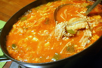 【豚キムチ鍋】 ①豚肉は食べやすい大きさに切り、白菜は短冊切り、豆腐は大きいさいの目、長葱は斜め切り、ニラは4㌢程に、生椎茸は千切りにする ②鍋にキムチ鍋の素と水を入れて沸かし、豚肉を入れて軽く火が通ったら他の野菜も入れる http://t.co/fJb4Ui6jmr