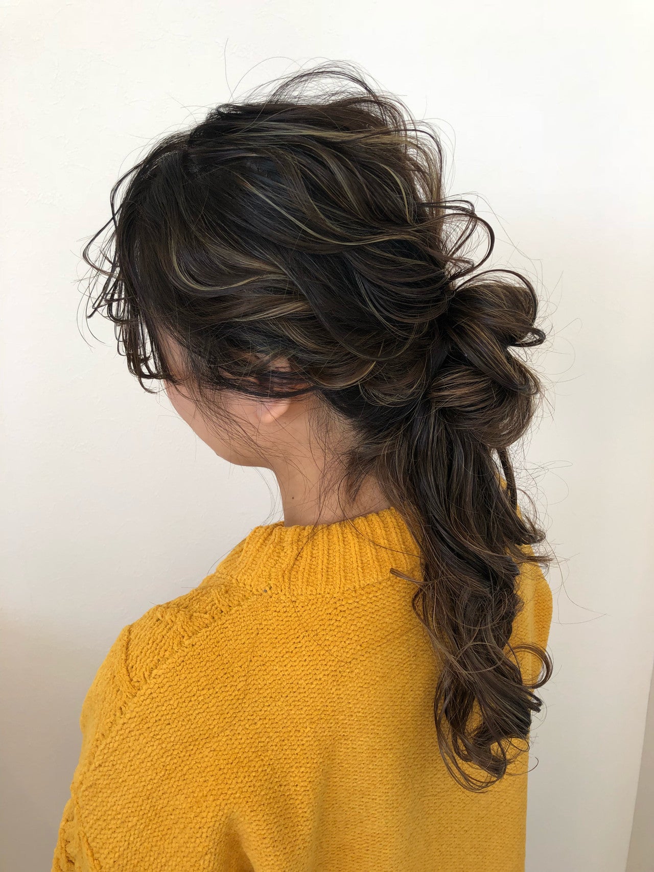 髪をしっかり巻いてからサイドの髪をねじってポニーテールに。ゴムを髪で隠して全体的に引き出せば完成♪