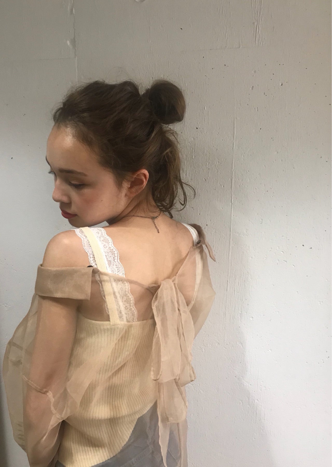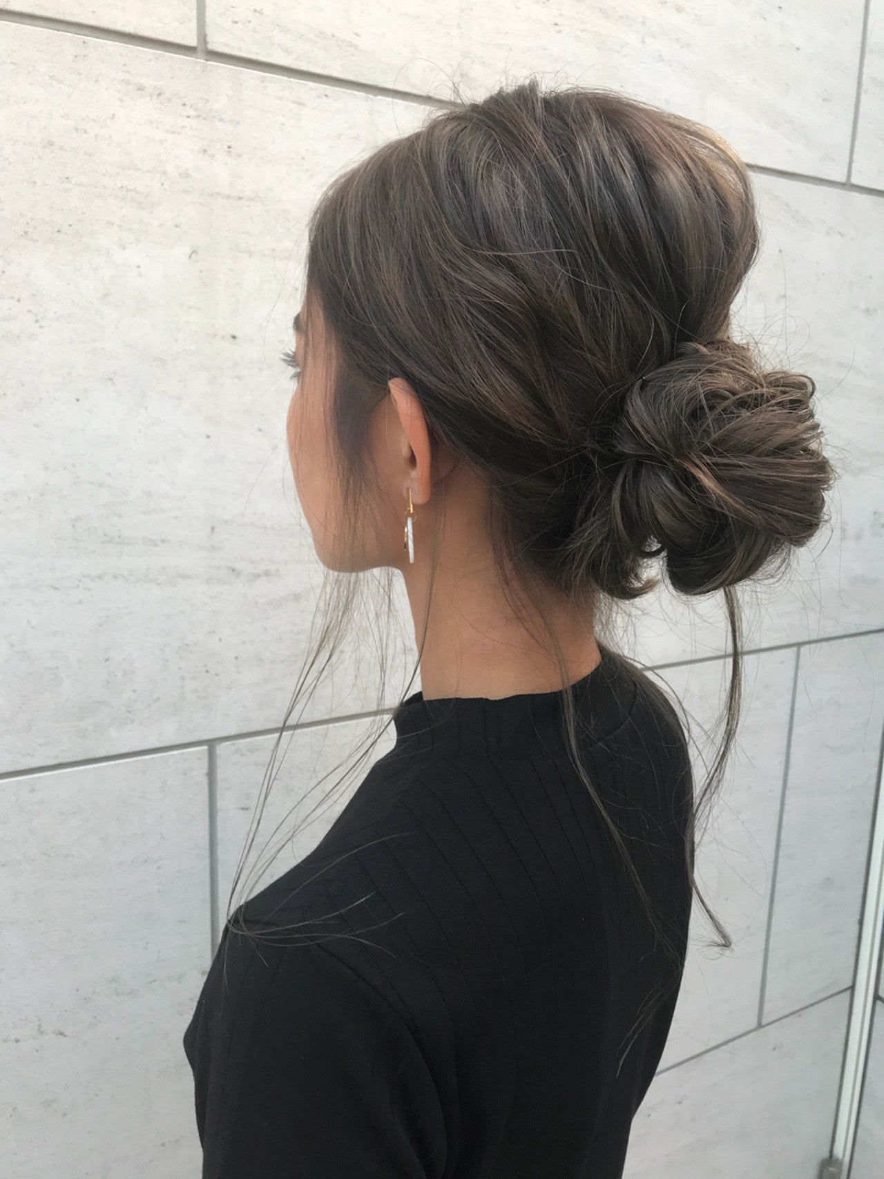 長め前髪の人は前髪もいっしょにまとめてルーズなお団子に!暑い時期にしたいアレンジです♪