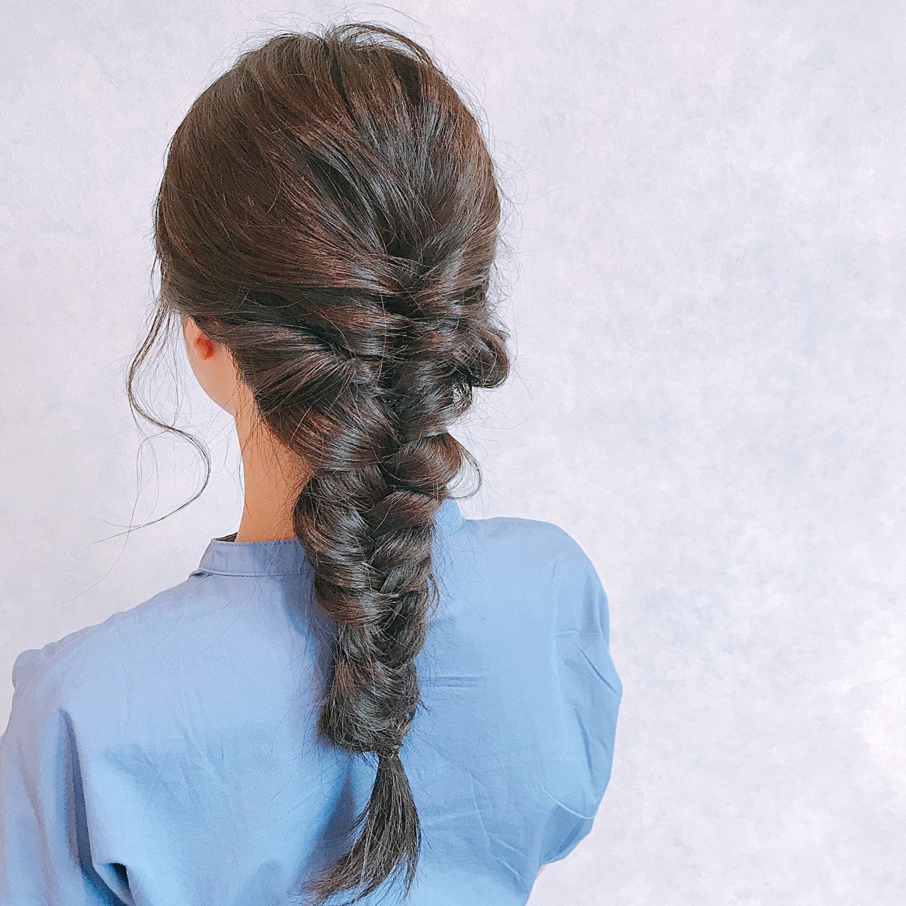 編み込み×三つ編みなら巻かなくてもOK!結んだらほんのり引き出すだけで華やかに仕上がります♪