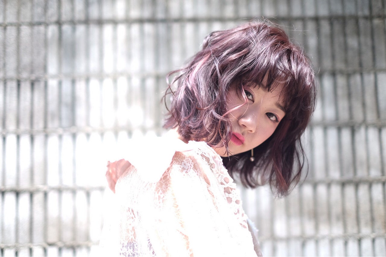 耳上の位置から大きめのコテでMIX巻きをして☆手でほぐしてエアリー感を与えると◎。