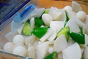 ■大根とキュウリ、ウズラの蜂蜜酢漬け