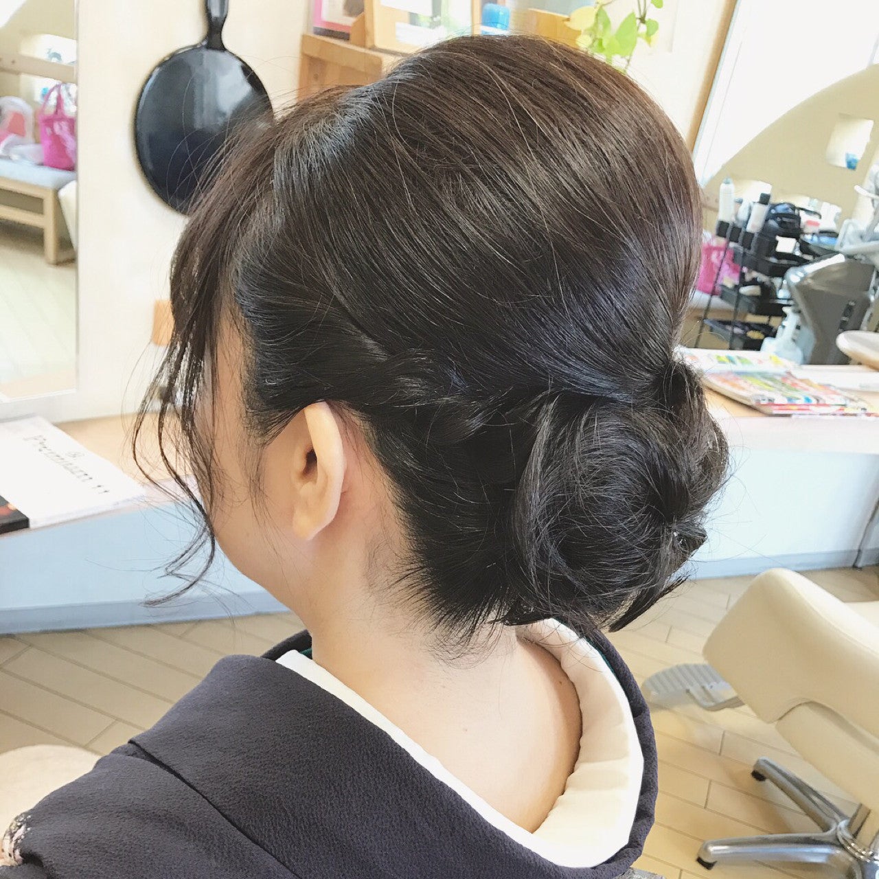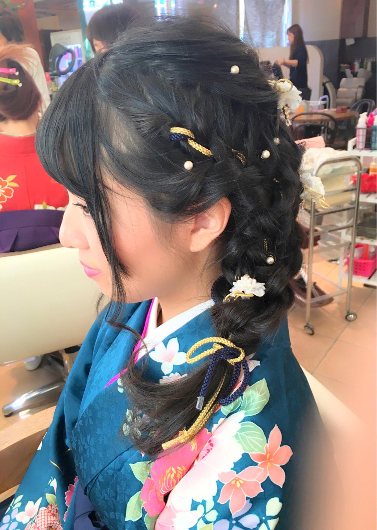 着物と編み込みアレンジは相性抜群。ヘアアクセサリーは紐やつまみ細工などの和のアイテムがぴったりです。