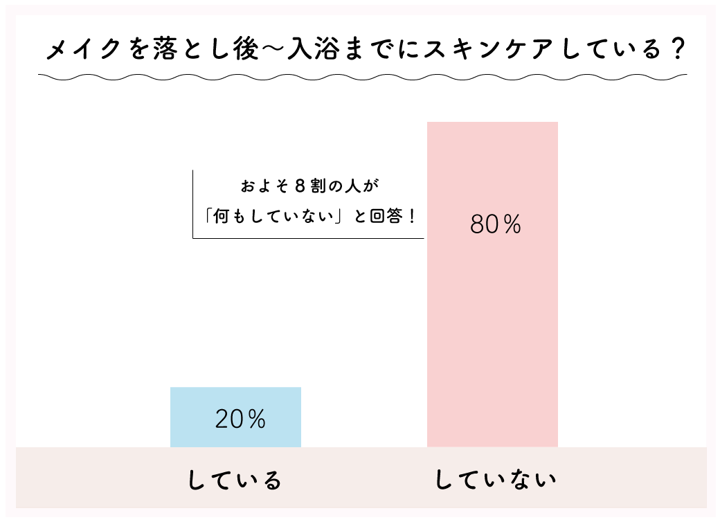 社内の編集部メンバー、そして友人など周りのアラサー女性にアンケートをとったところ、メイクを落としたあと、入浴の前に一時的なスキンケアをするという人はわずか2割。残りの8割が「特に何もしていない」という回答結果だったんです。