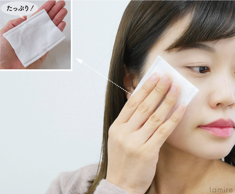 メイクを落としたらコットンに化粧水を染み込ませ、それを使って顔全体を優しく拭き取ります。摩擦を少なくするためにも、化粧水の量はたっぷりと!メイク残しがないように、まんべんなく行います。