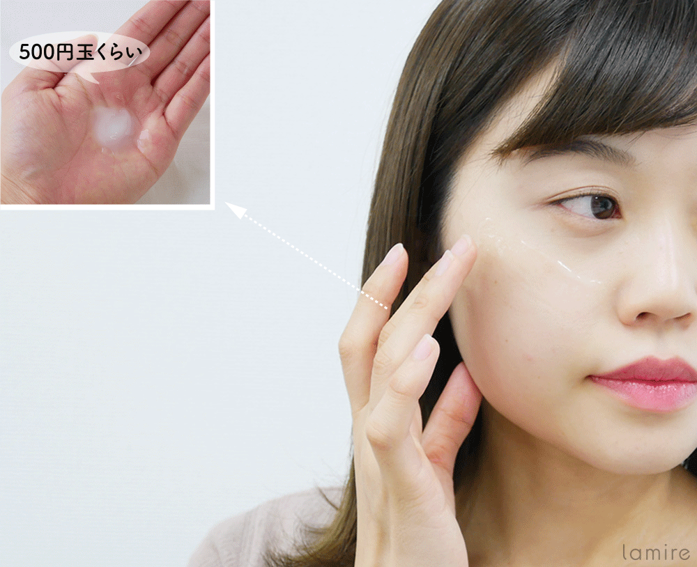 最後は潤いが逃げないように、乳液or保湿ジェルを重ねます。こちらもたっぷりと500円玉くらいの量を目安に。