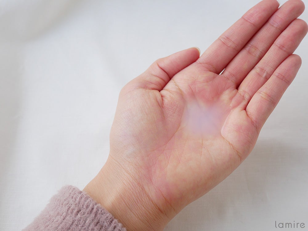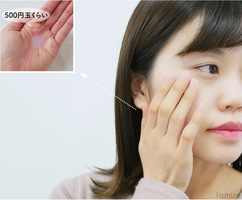 拭き終えたら、化粧水を500円玉くらいの量手に取り、ハンドプレスで肌になじませていきます。手の熱で化粧水を温め、潤いを内側に浸透させるイメージで行うと◎ 乾燥しやすい秋冬は化粧水の量を増やすなど、季節や肌の状態に合わせて量を調整するといいでしょう。