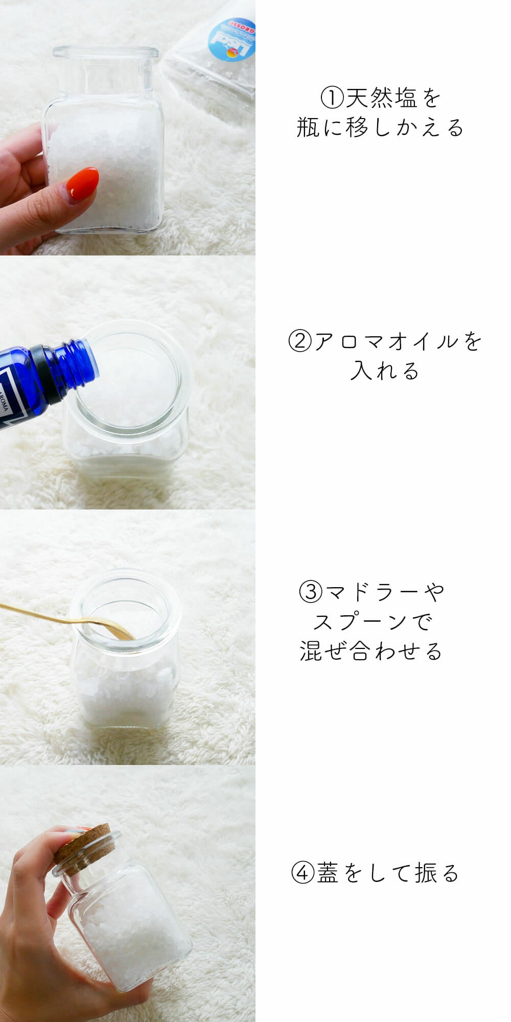 天然塩とアロマオイルを混ぜ合わせるだけなので、失敗知らずです!天然塩100gに対して、アロマオイル10滴を目安に入れてくださいね。
