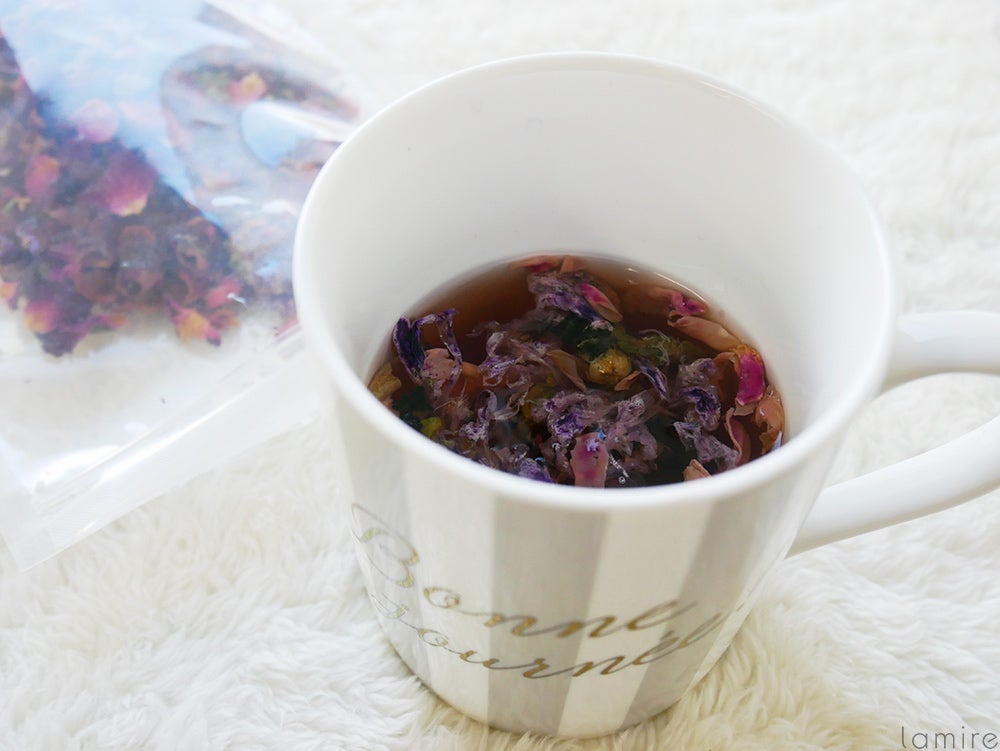 今回使用したのは、ローズヒップ・マローブルー・ローズレッドが配合されたハーブティー。ハーブティーは濃いめのパープルですが、きれいなピンク色になりました♡ローズ形のアロマオイルを入れると女子力が上がりそうですね。