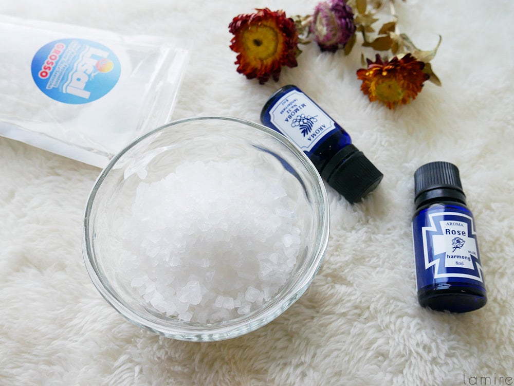 アロマバスソルトを作るのに使うのは、天然塩と好きなアロマオイルのみ。天然塩は、一般的に料理に使われるサラサラした粒子の細かいものよりも、ザクザクしたものを使った方が香りが立ちやすいですよ。