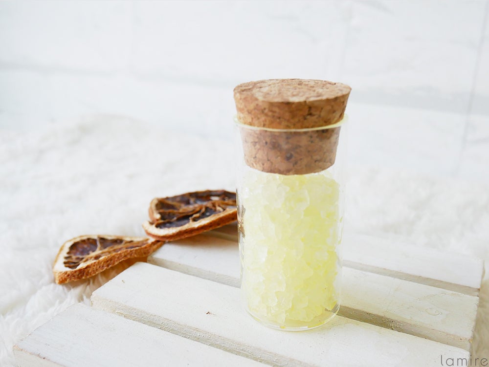 こちらが完成形です!パステルイエローのアロマバスソルトは見た目もかわいいですね。柑橘系の爽やかな香りもして、バスタイムが楽しみになりそう。