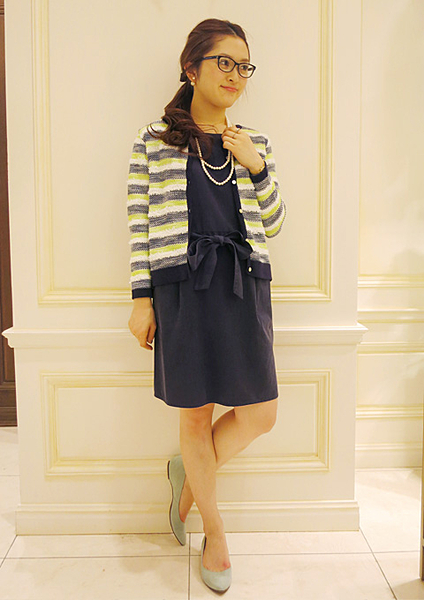 ウェストの細めリボンがキュっとウェストを絞ることでやぼったく見えない、洗練されたフォーマルスタイルに。