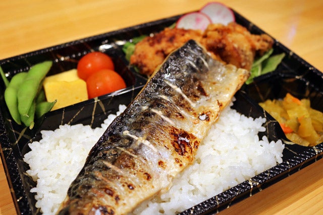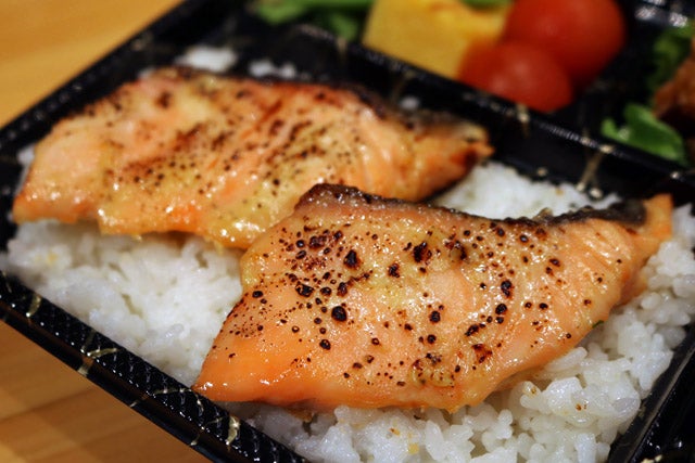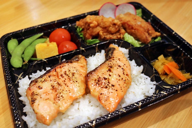 人気の西京焼きは鮭の切り身が2枚も入っています。副菜はから揚げやウィンナーなど3種類あるので、早めに行って好きな組み合わせを選んでくださいね。