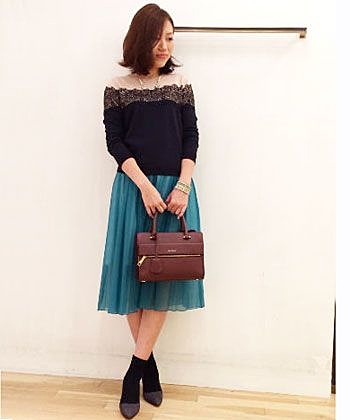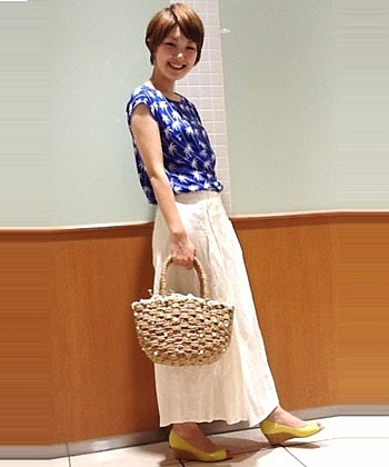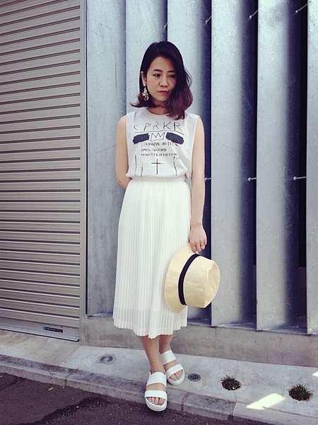 太めのプリーツが特徴のこちらのスカートはカジュアルにも決まります。