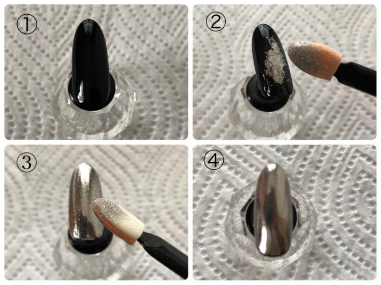 ②チップにミラーパウダーを適量とり、爪全体にポンポンとのせていきます。