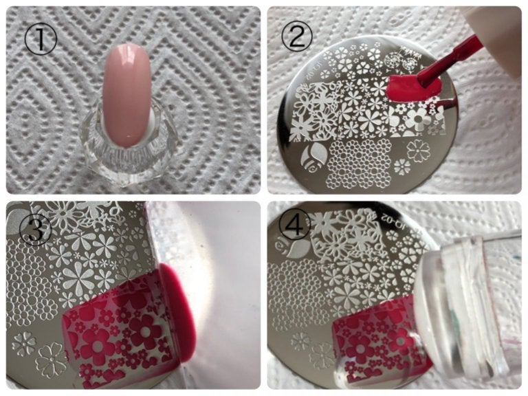 2. ①ベースカラー塗布後、しっかりと乾かします。②プレートの使いたいデザインを覆うように、たっぷりとポリッシュをのせます。