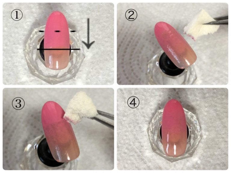 ②ベースジェルとカラージェルの境目を、スポンジでぼかして硬化します。