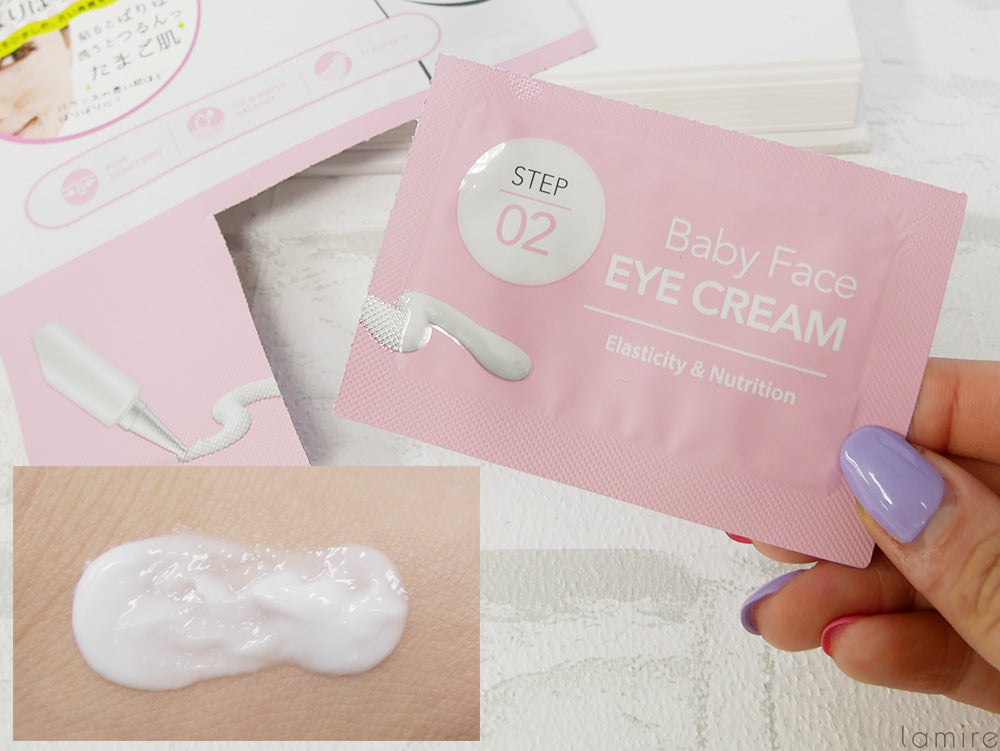バリバリを実感したら、お湯で洗い流してSTEP2のアイクリームを塗っていきます。アイクリームですが顔全体に塗ってOKです。かなり伸びのいいクリームで、ふわっと優しい香りがしましたよ。