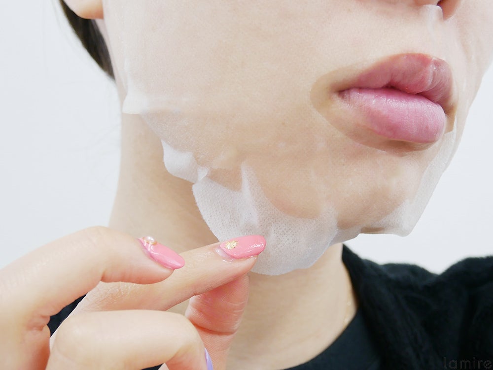 フェイスマスクを取り出して顔にのせていきます。少し大きめに作られているのか首辺りまでありましたよ。普通のマスクであれば美容成分を首まで伸ばしたいところですが、これは他のマスクとちょっと違うのでやめておいたほうがいいかも。このまま5〜8分待ちます。このマスクは剥がしてからがスタートです。
