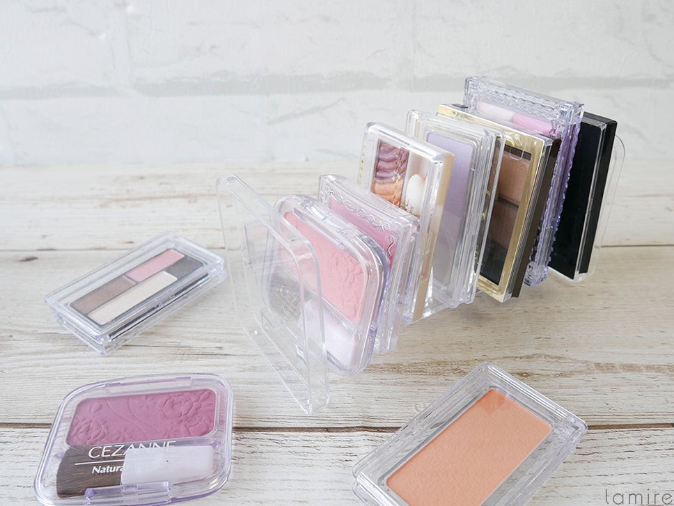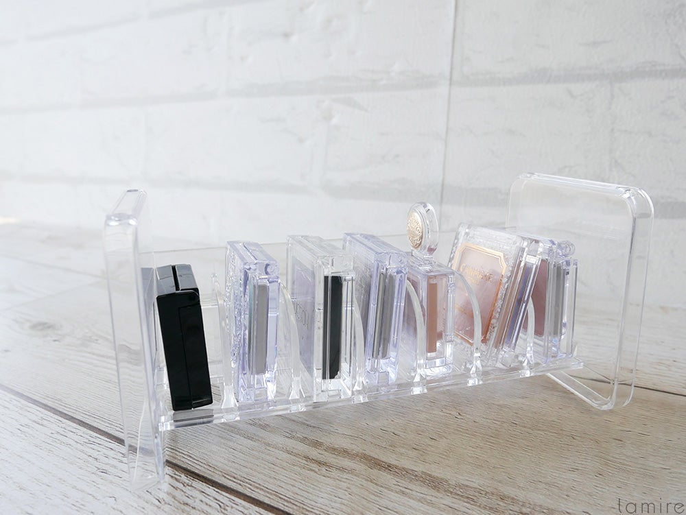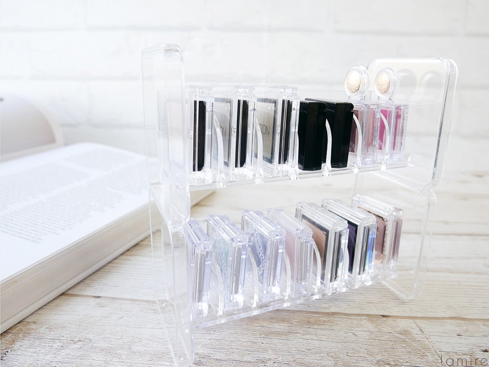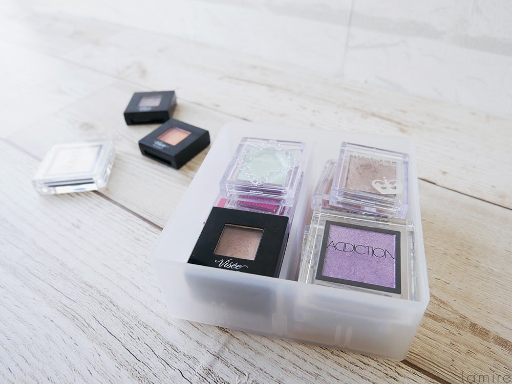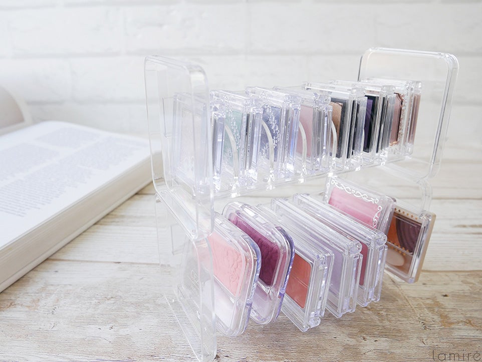 上段はアイシャドウ、下段はチーク…など分類して収納すれば、ひと目でコスメがわかるので文句なしにきれいな収納ができそう。