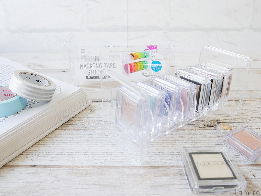 そこで使えるのが、ダイソーに売っている「マステストッカー」!マスキングテープを収納するために作られた商品ですが、なんと単色アイシャドウもピッタリはまると、SNSで話題になっていますよ。マステが7つ入る作りなのですが、どんな単色アイシャドウでも入るのか?など、使いやすさを調査してみました。