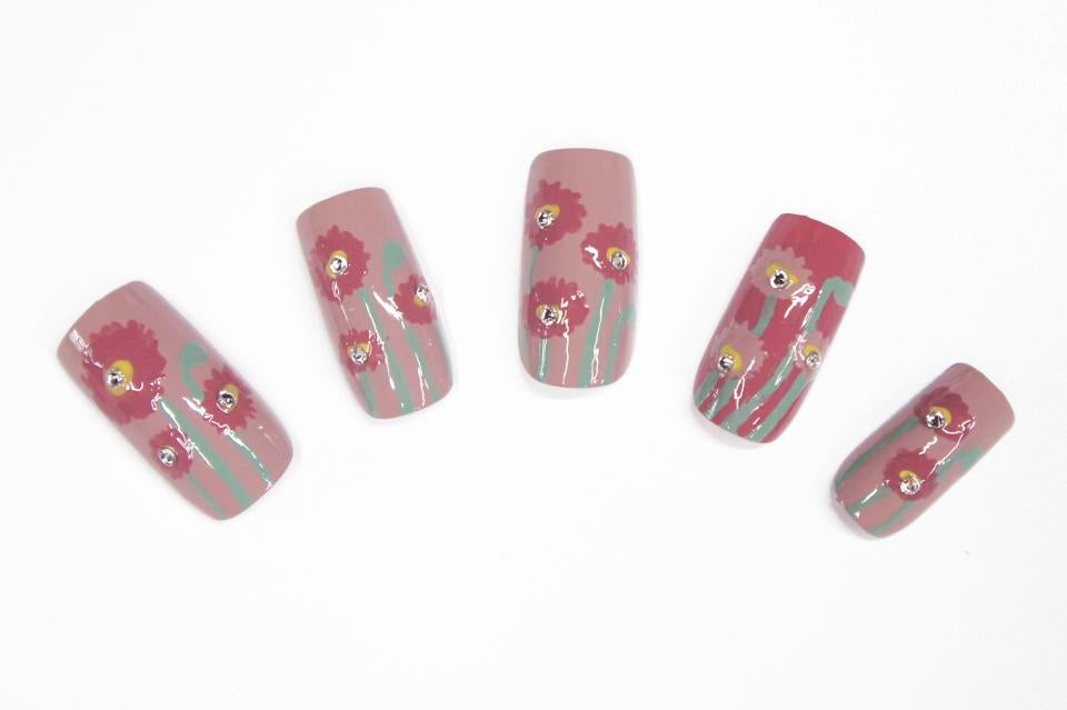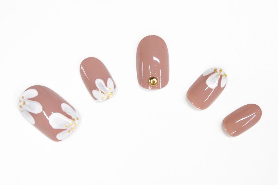 落ち着いた花霞にお花を組み合わせて、大人可愛い春ネイルに♡