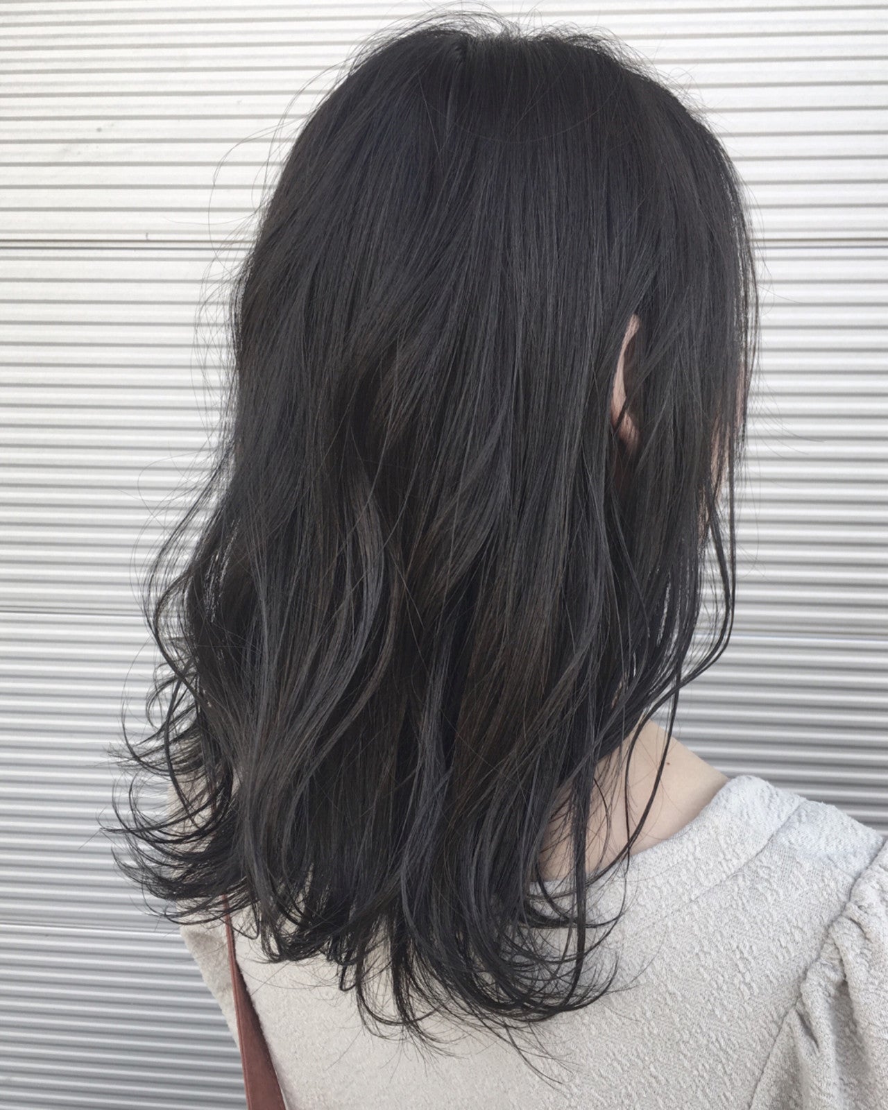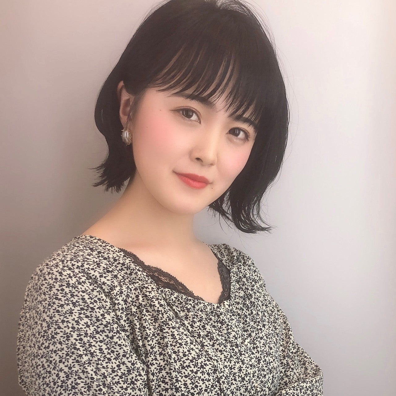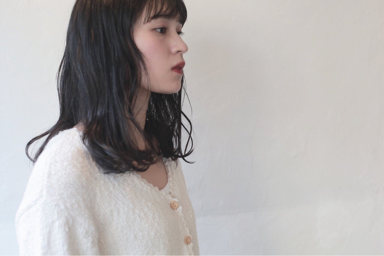 ワンレングスベースでカットして、毛先にラフな切りっぱなし感を出したかわいらしい黒髪ミディアム。