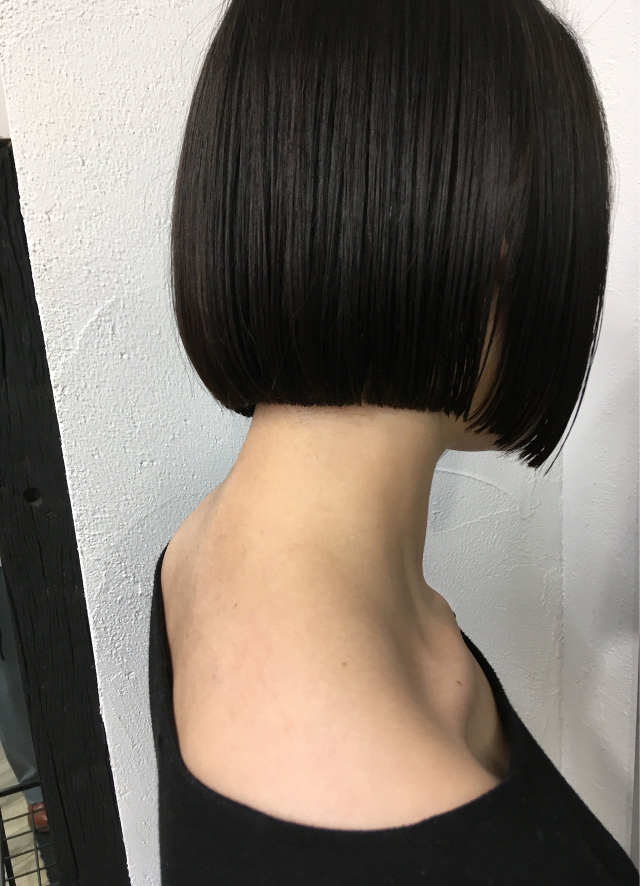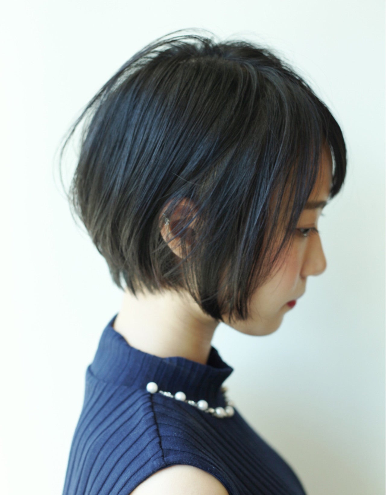 きれいに切りそろえた襟足が魅力のシンプルさが美しいミニボブ。ナチュラルなツヤ感を出すには黒髪が一番!