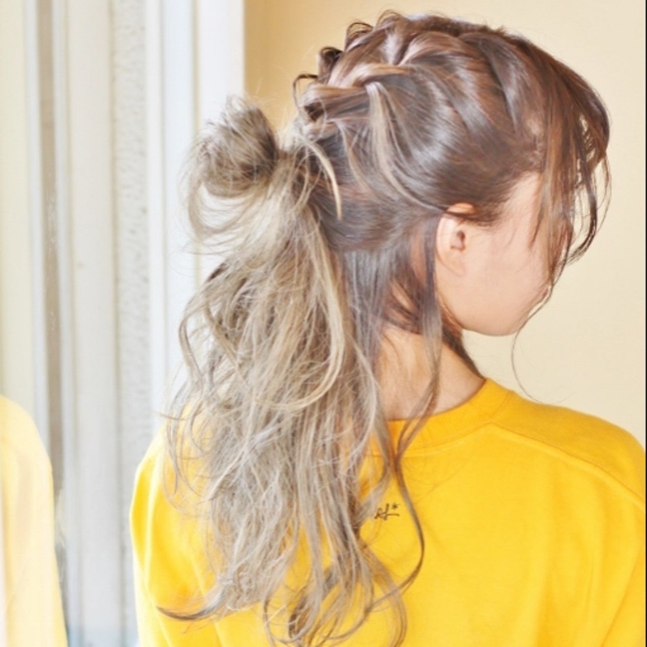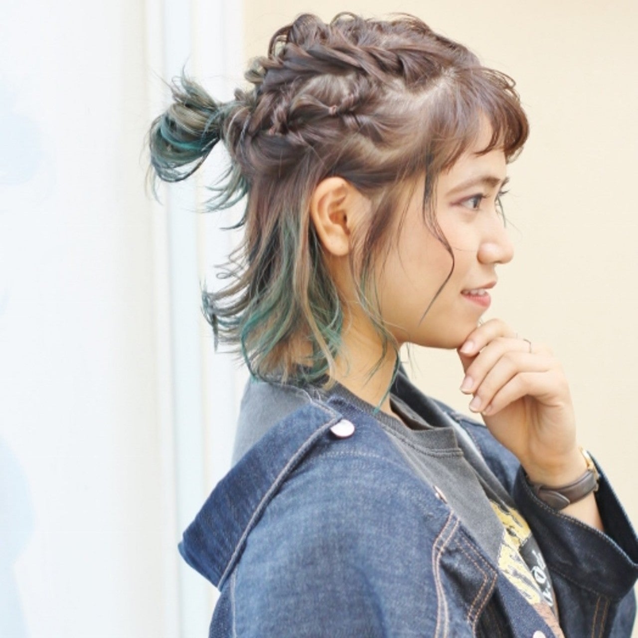 ボブスタイルの上半分をロープ編みとくるりんぱでアクセントとつけてから、小さめのお団子を作ったハーフアップスタイルです。ストリート系のカジュアルなファッションによく似合います。