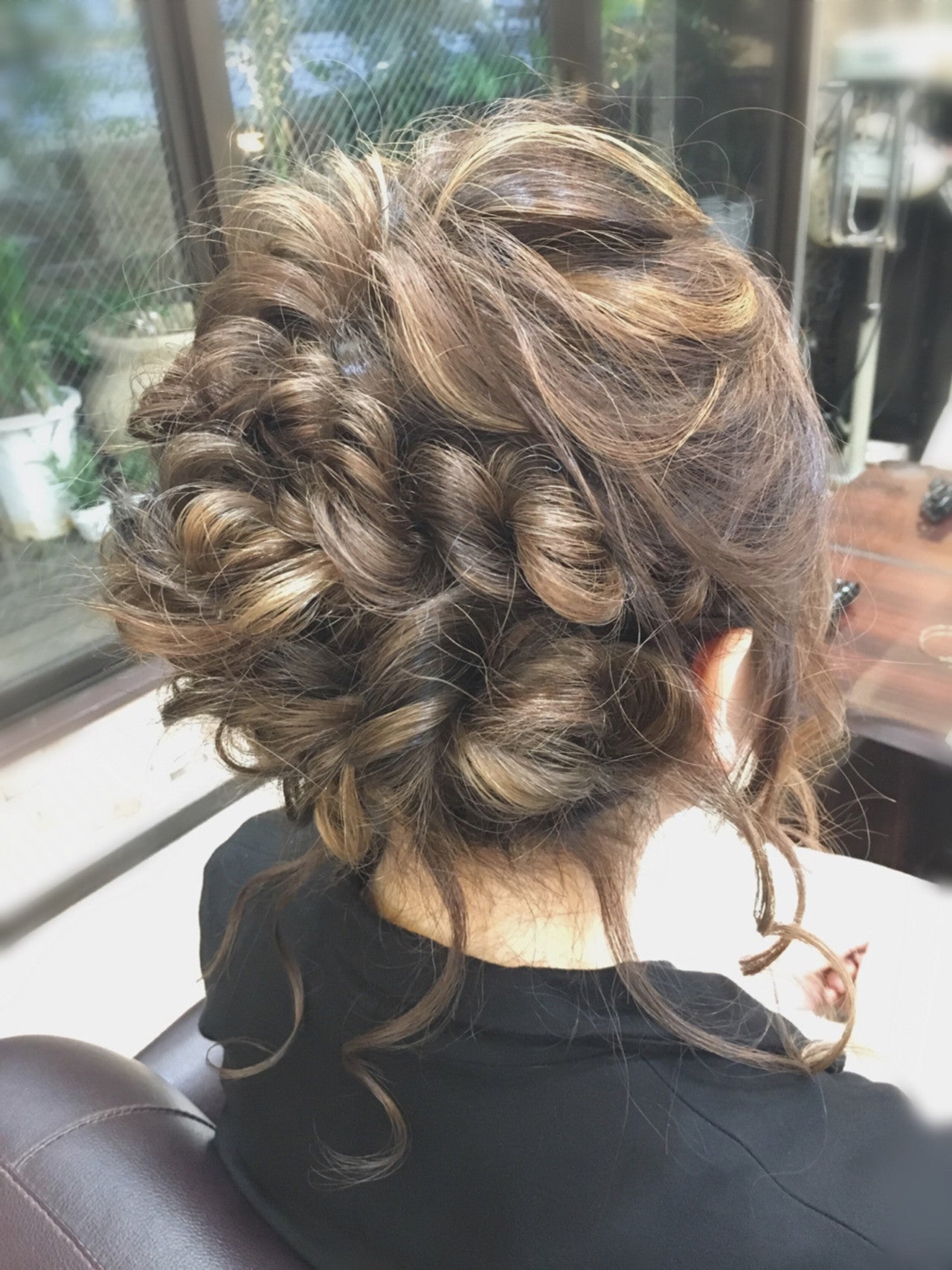 くるりんぱとロープ編み込みで作る、どこから見てもボリューム満点の華やかでフェミニンなパーティーアレンジです。ハイライトが入っているので、髪の流れがより立体的にみえるのがポイントです。