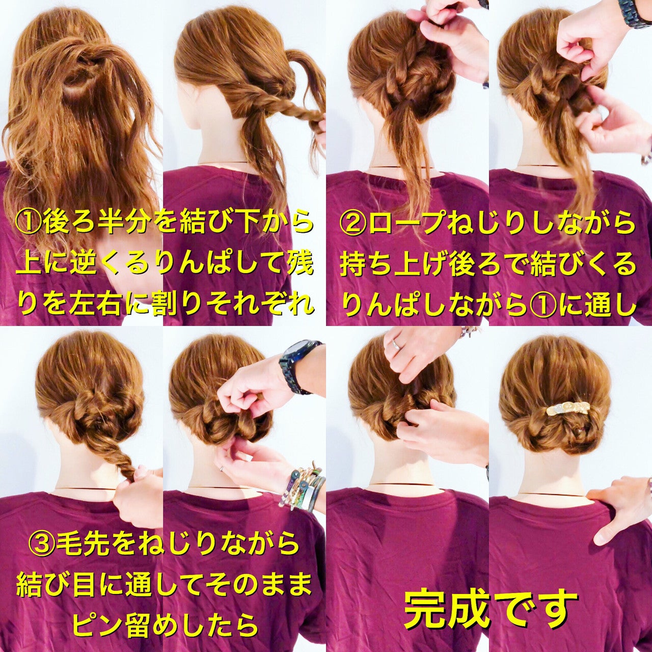 後ろの上半分を結んで下から上に逆くるりんぱします。その後、残りの髪を左右に分けて、それぞれをロープねじりしながら持ち上げて後ろで結びます。結んだ髪をくるりんぱしながら先に結んでおいた場所に通して、毛先をねじりながら結び目に通してピン留めします。