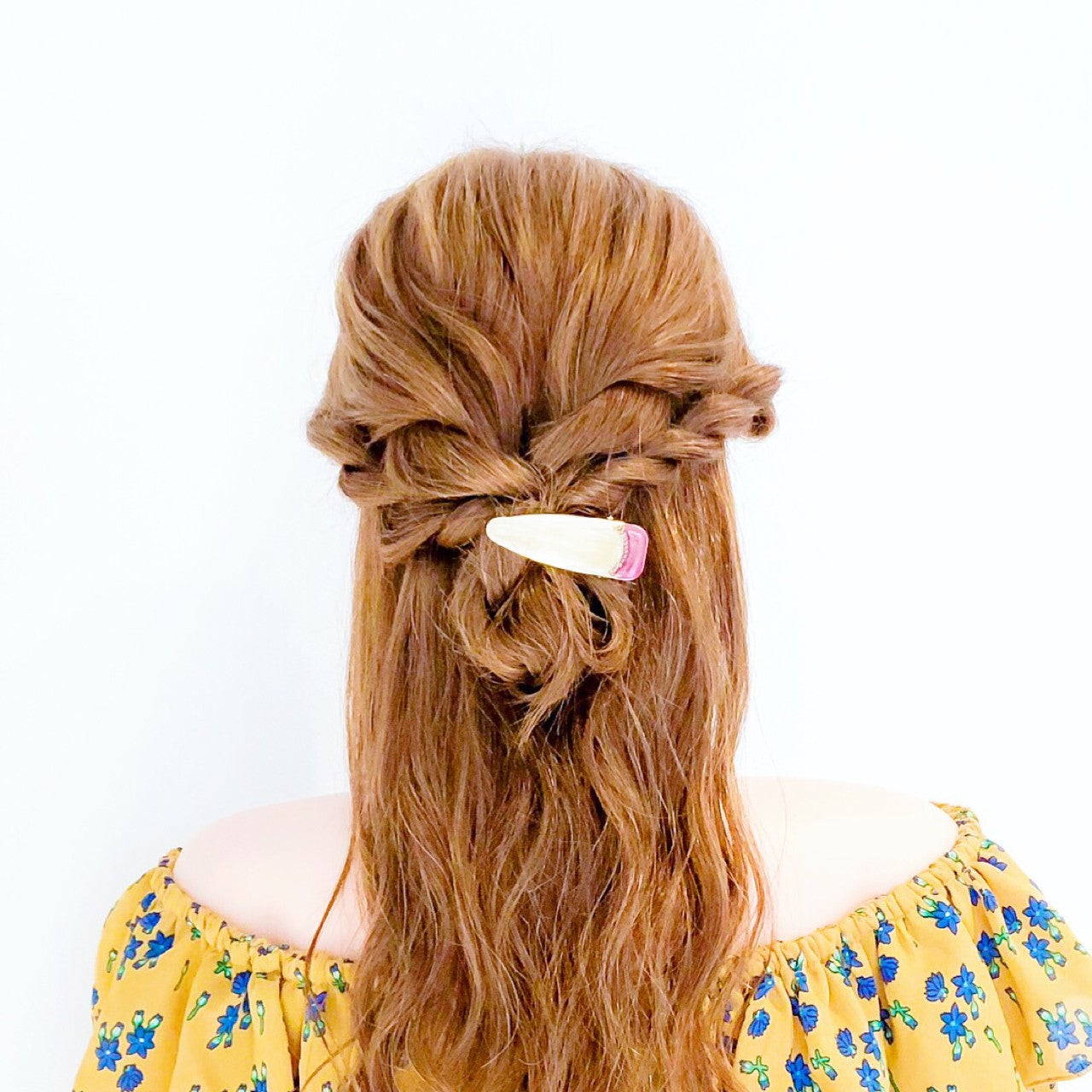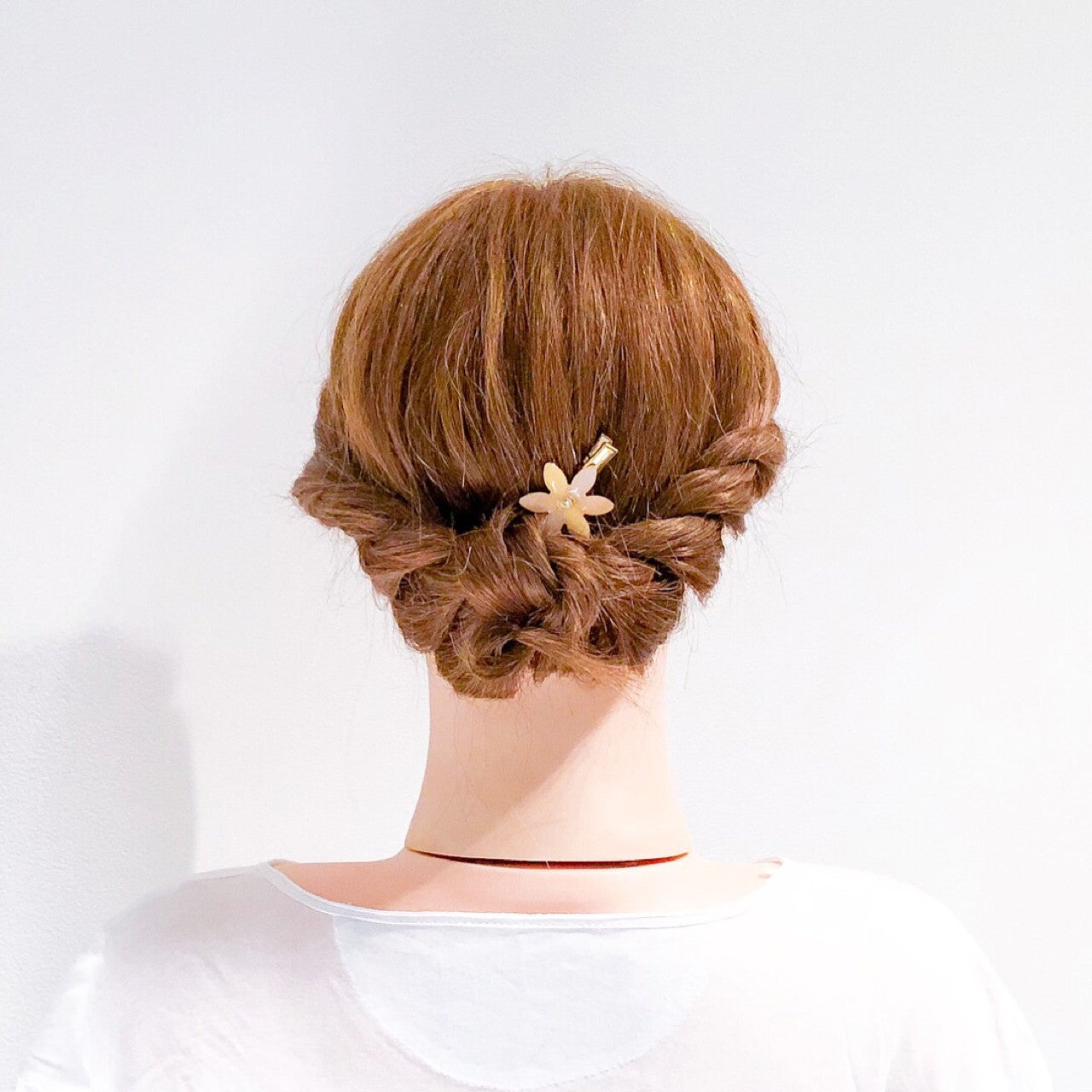 後ろ部分の髪を左右に分けてから交差させましょう。それぞれ両サイドに残した髪と一緒にくるりんぱします。その後、毛先をそれぞれロープねじりしていきながら外側から丁寧に丸めていき、ピン留めします。