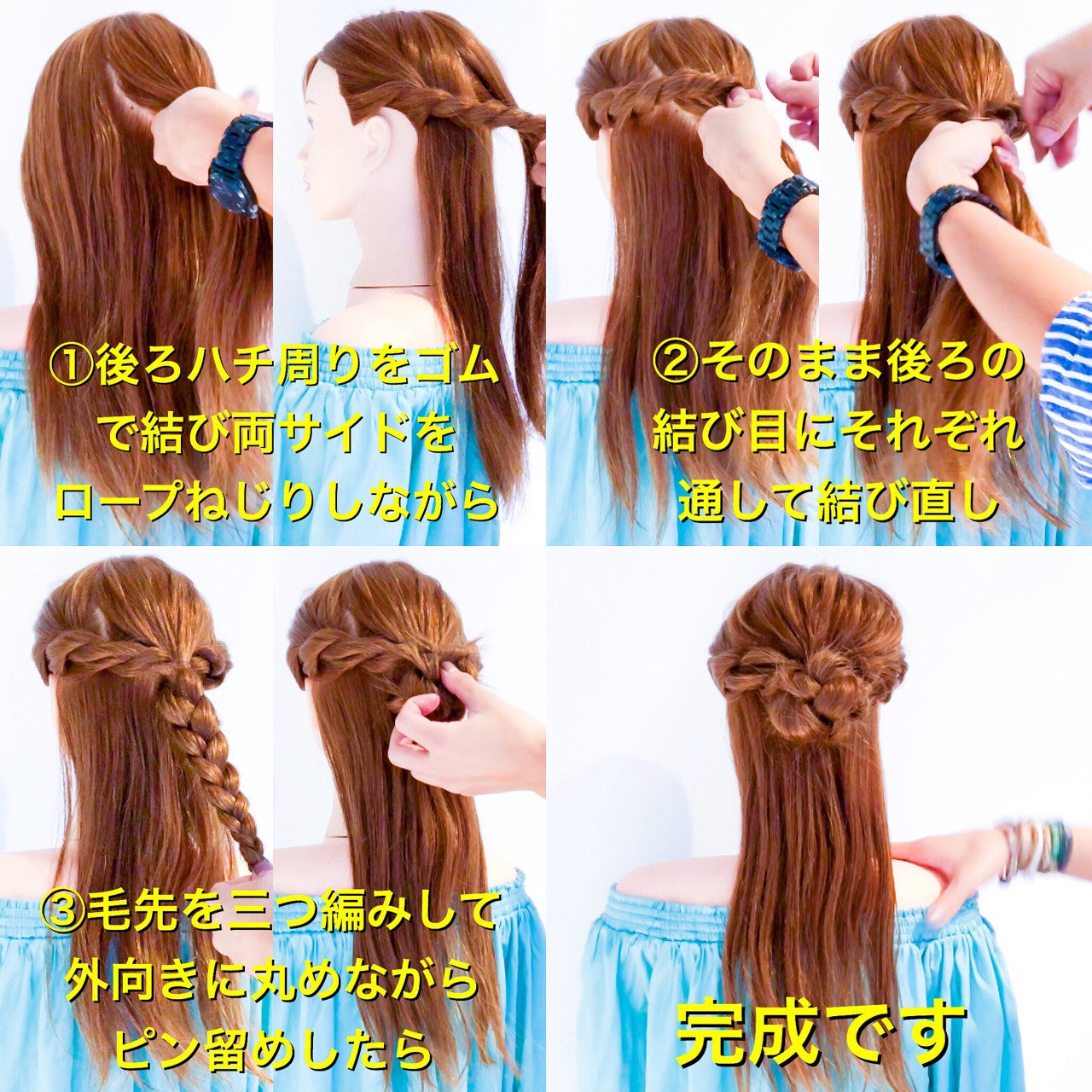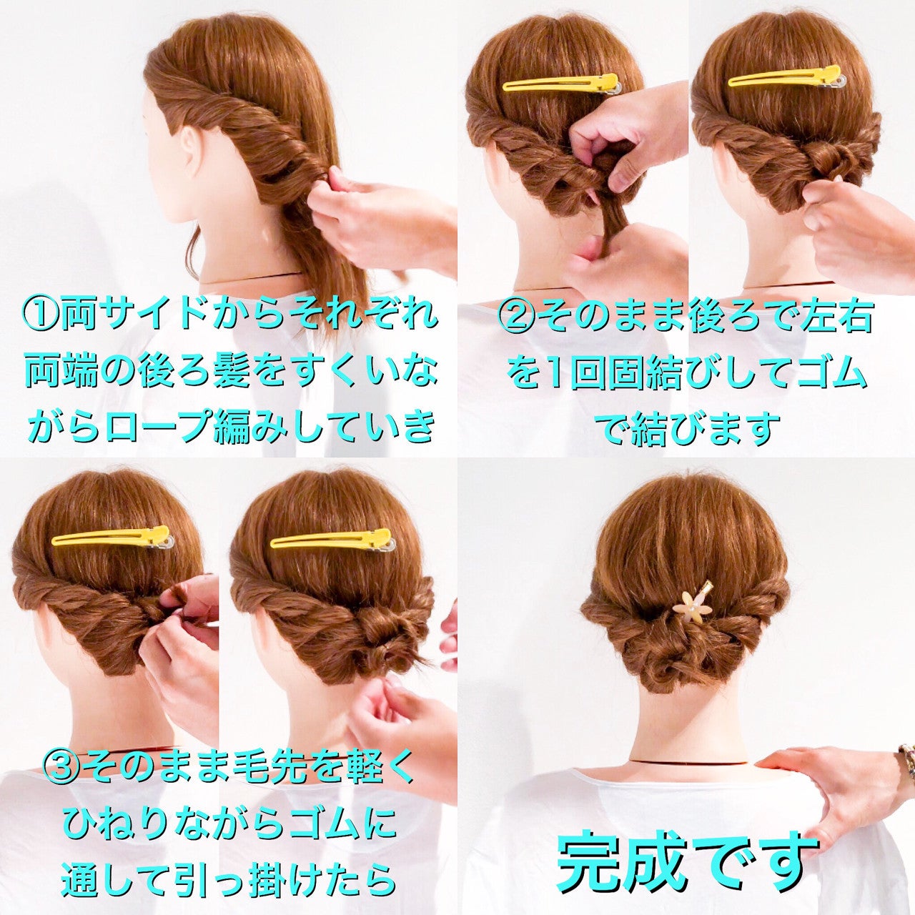 ハチ周りを左右に分けてからそれぞれロープねじりしてゴムでひとつ結びします。両サイドに残した髪もロープねじりし後ろでひとつ結びしたゴムに通します。毛先をロープねじりしながらくるりとまわしてゴムに通したら出来上がりです。