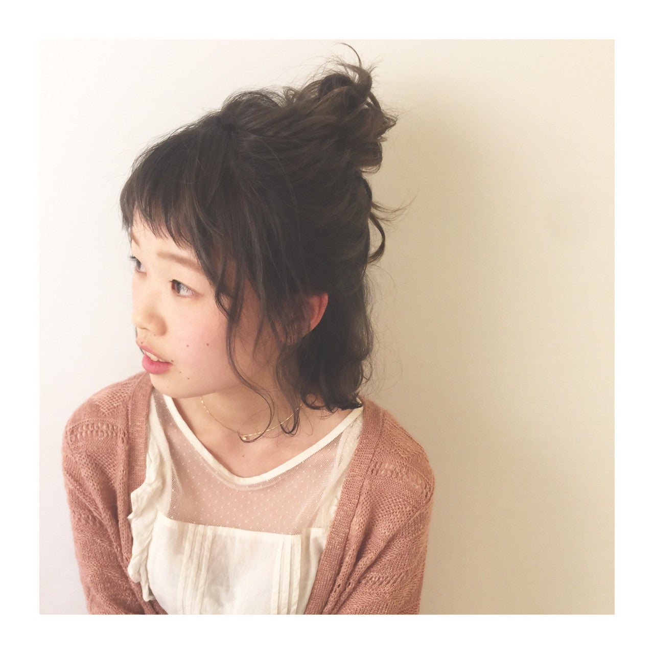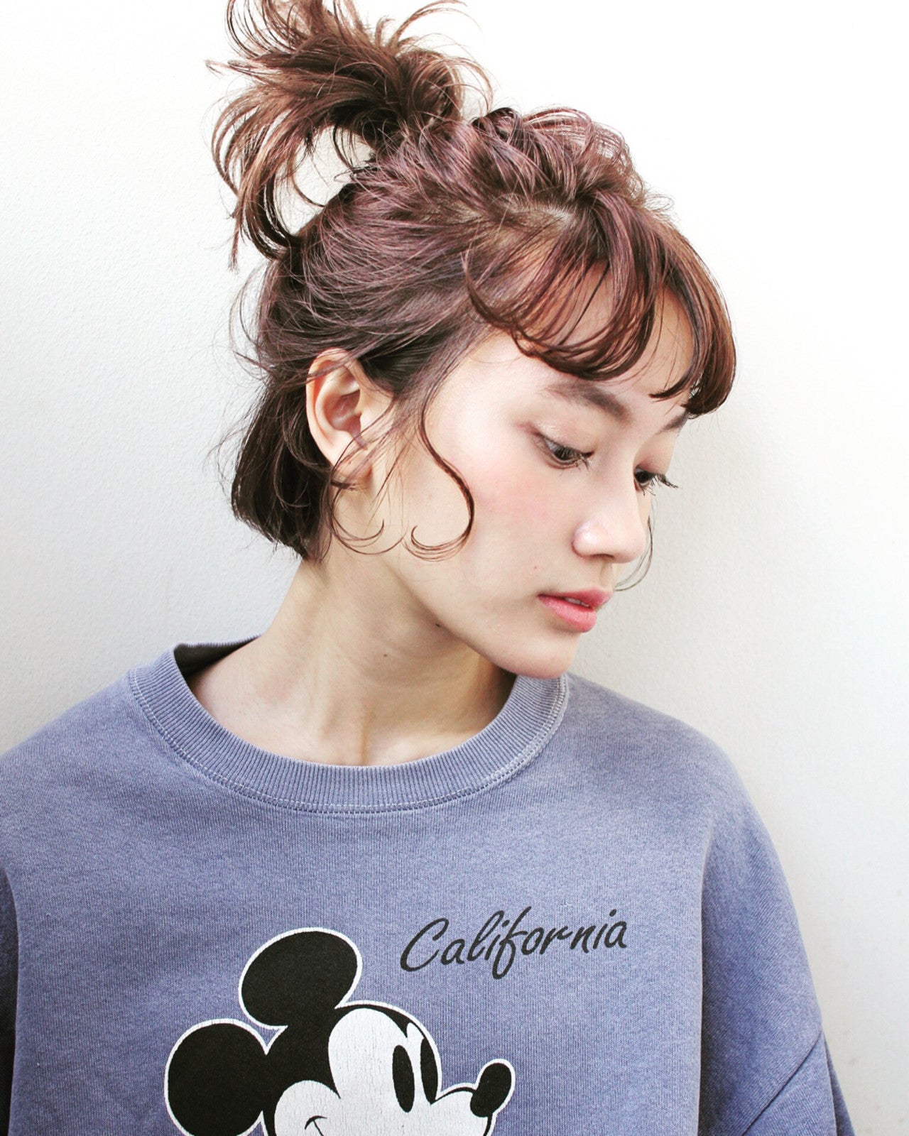 後れ毛の髪をたっぷりと残しながらも、耳上ラインのサイドの髪をゆるっと取りながら高い位置でお団子にして♡サイドの後れ毛はコテでゆる巻きにして、ふんわり感をアップさせると◎。