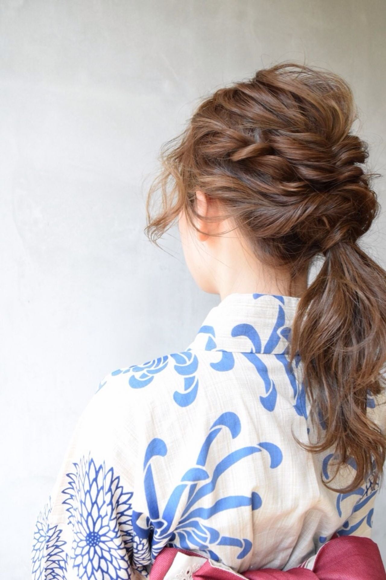 トップの高い位置から編み込みを開始!毛先まで三つ編みにしてまとめたら、毛先を右耳上部分でピン留めして完成!後れ毛を出して色っぽく仕上げてくださいね。