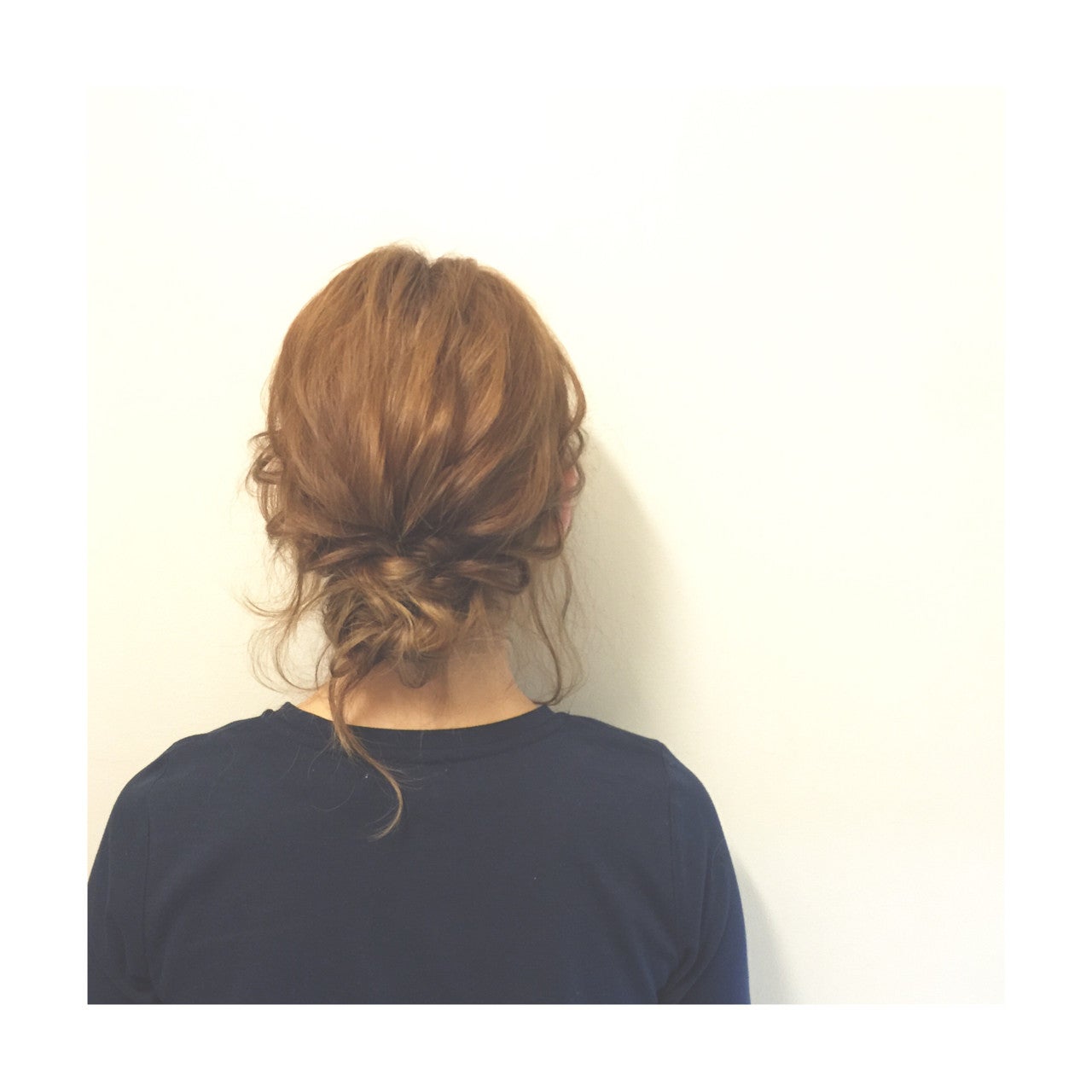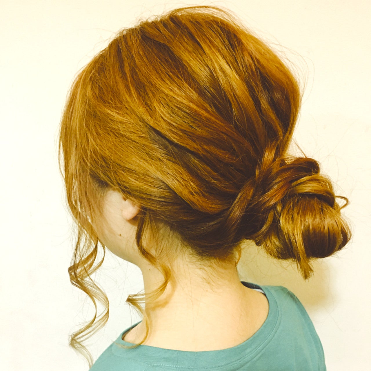 髪を3つに分けて、バックの低い位置でゆるっとお団子をつくります。サイドの髪はねじりながらお団子ゴム部分に巻きつけて☆サイドのねじり部分を手で引っ張ってゆるふわ見せさせて完成です☆