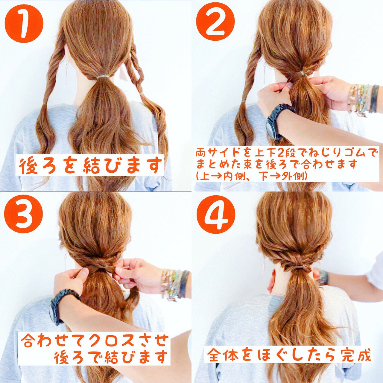 サイドの髪を取り分けて、バックでひとつに結びます。サイドの髪をねじりながら後ろで交差させ、結び目の裏でもう一度交差。結び目の上でくるりんぱして完成です。毛量多い人もすっきりと髪をまとめるられて◎。