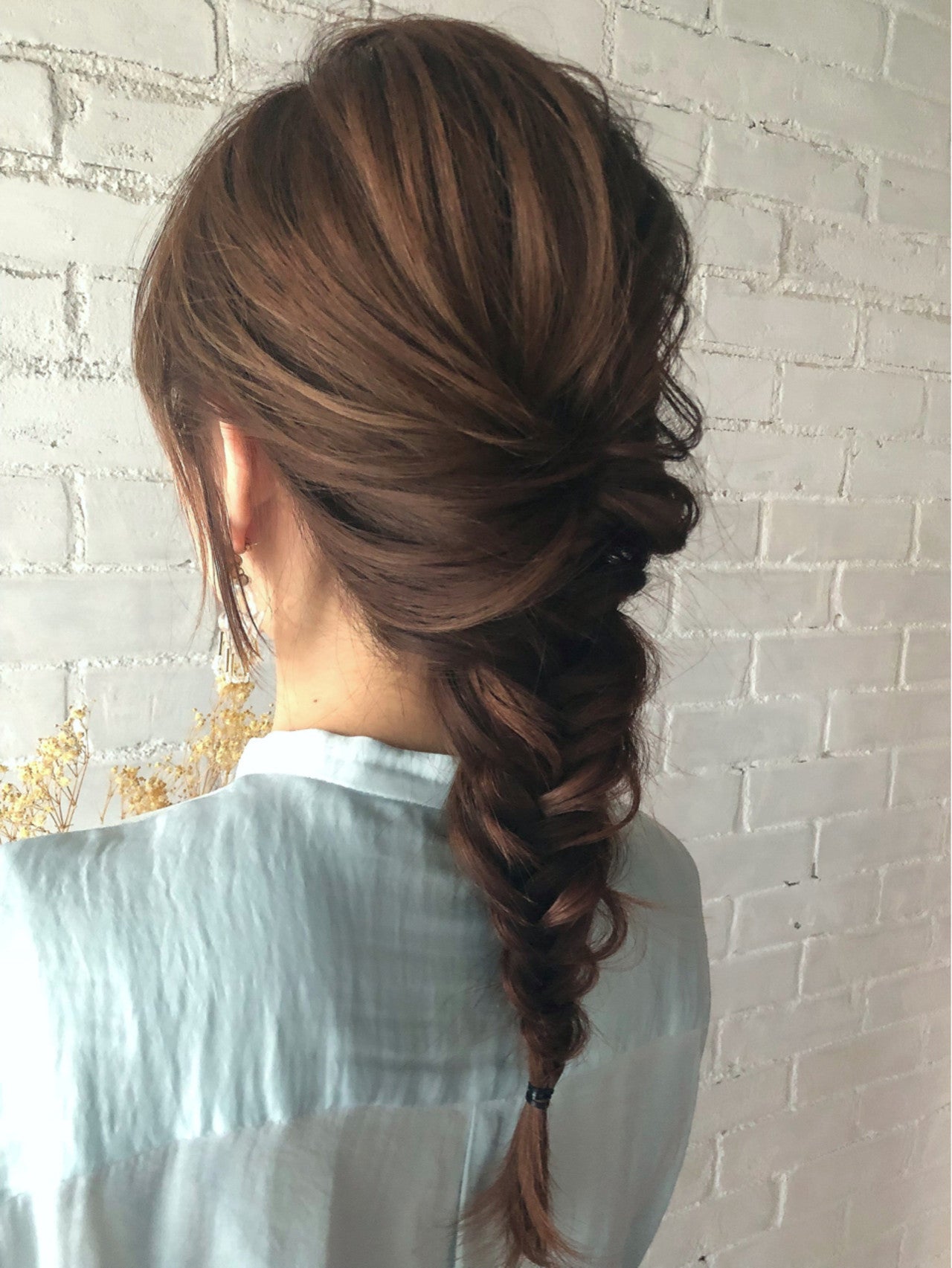 全体をフィッシュボーン編みしながらまとめるヘアスタイル♡編み目を強調することで、周りよりおしゃれなヘアスタイルになれます。後れ毛を出して、女性らしく仕上げるとおばさんっぽくなりません。