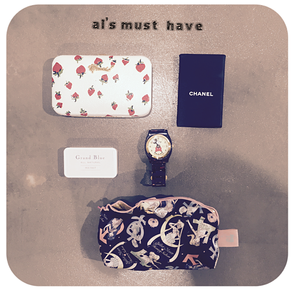 左上から時計回りに、イチゴ柄がお気に入りのMUVEILのカードケース、頂き物のシャネルのミラー、べっ甲柄がツボの時計、頂いてまだ使ったことはないけど持ち歩いてるお塩、大好きなセーラームーンとコラボしたハニーサロンの化粧ポーチです。
