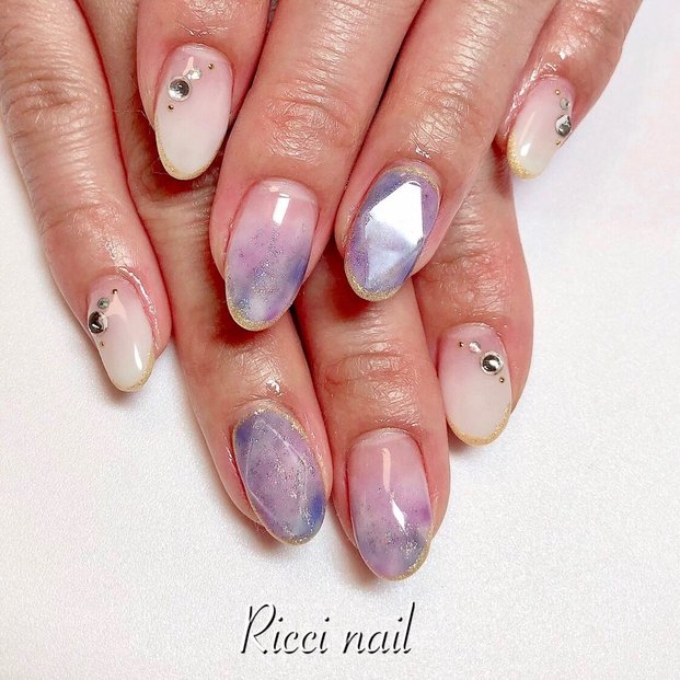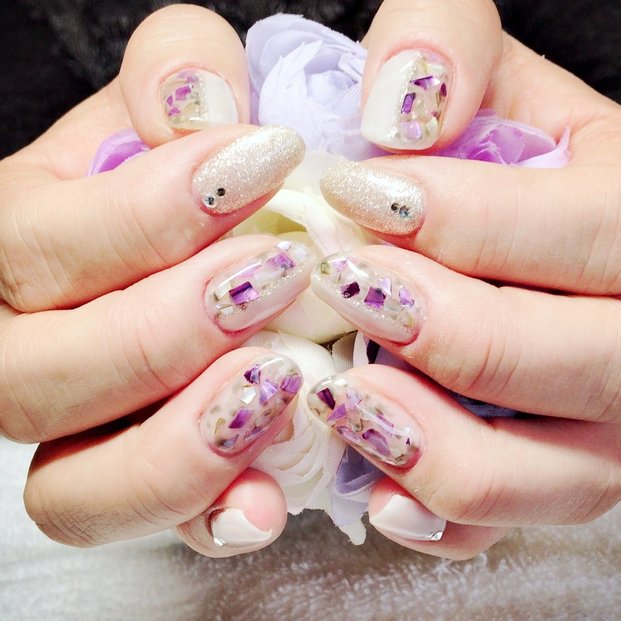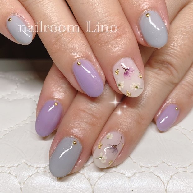 この春も人気のパープルはホワイトと相性抜群です。毎年定番の押し花ネイルも、トレンドカラーを取り入れれば旬な指先に仕上がりますね。