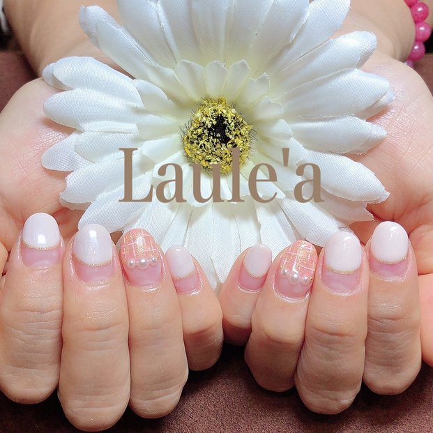 ピンクカラーのツイードネイルを取り入れれば、フェミニンな印象がアップします。上品なツイード柄は、オフィスシーンでも使える好印象なデザインです。