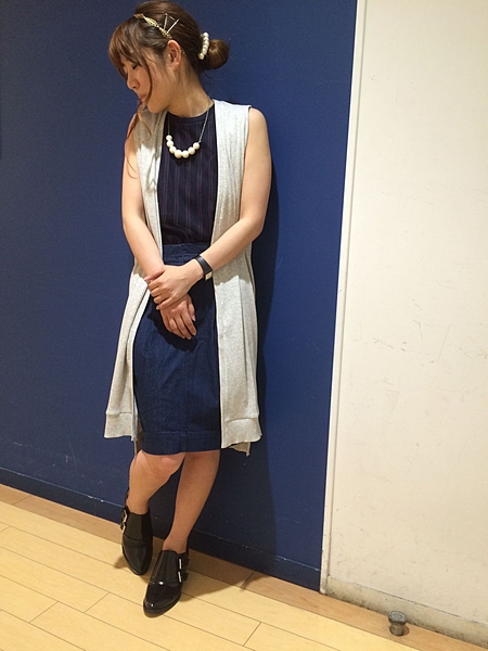 チョークストライプのダウンベストは、メンズライクなデザインなのでパンツもスカートもコーディネートO.K◎